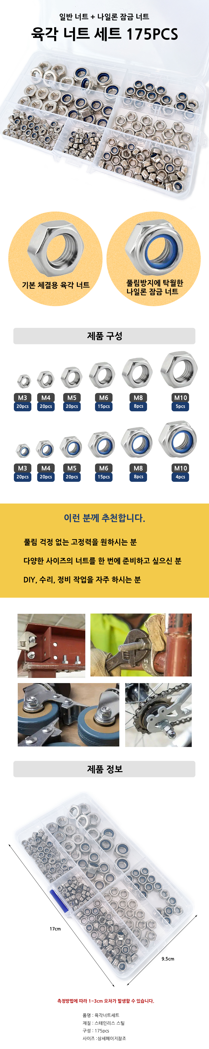 육각너트 175pcs 풀림방지 락너트 스테인리스 너트 세트